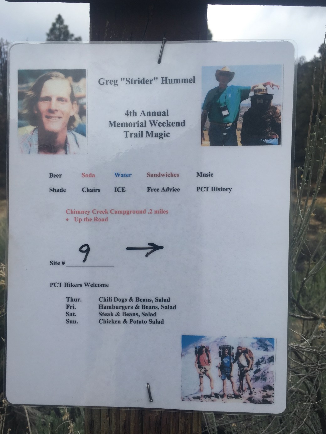 We stayed at Chimney Creek Camp where we met Greg Hummel, who was putting on some Memorial Day weekend trail magic. We had met him and his wife back on day six at the Pioneer Mail Day Use Area where he told us about this event, but not where it would take place. At the time we were convinced we would be nowhere near the event and had just casually guessed where we though it would occur. Greg was one of fifteen people to hike the PCT in 1977; it was so neat to hear about his experiences hiking and the evolution of backpacking since he started.