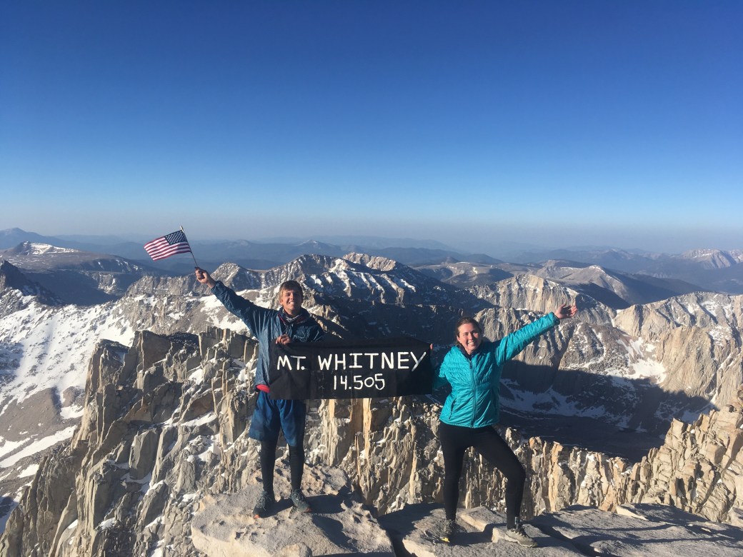 We got to the top just a few minutes before the sunrise and it did not disappoint. The mountains were absolutely spectacular; I will never tire of the views. We sat in our sleeping bags to warm up and waited for the sun to warm us. It was so cold our water bottles started to freeze. There were also adorable little birds flying around at the top that I could just imagine saying, “Oh hello, we did Mt. Whitney this morning too!”