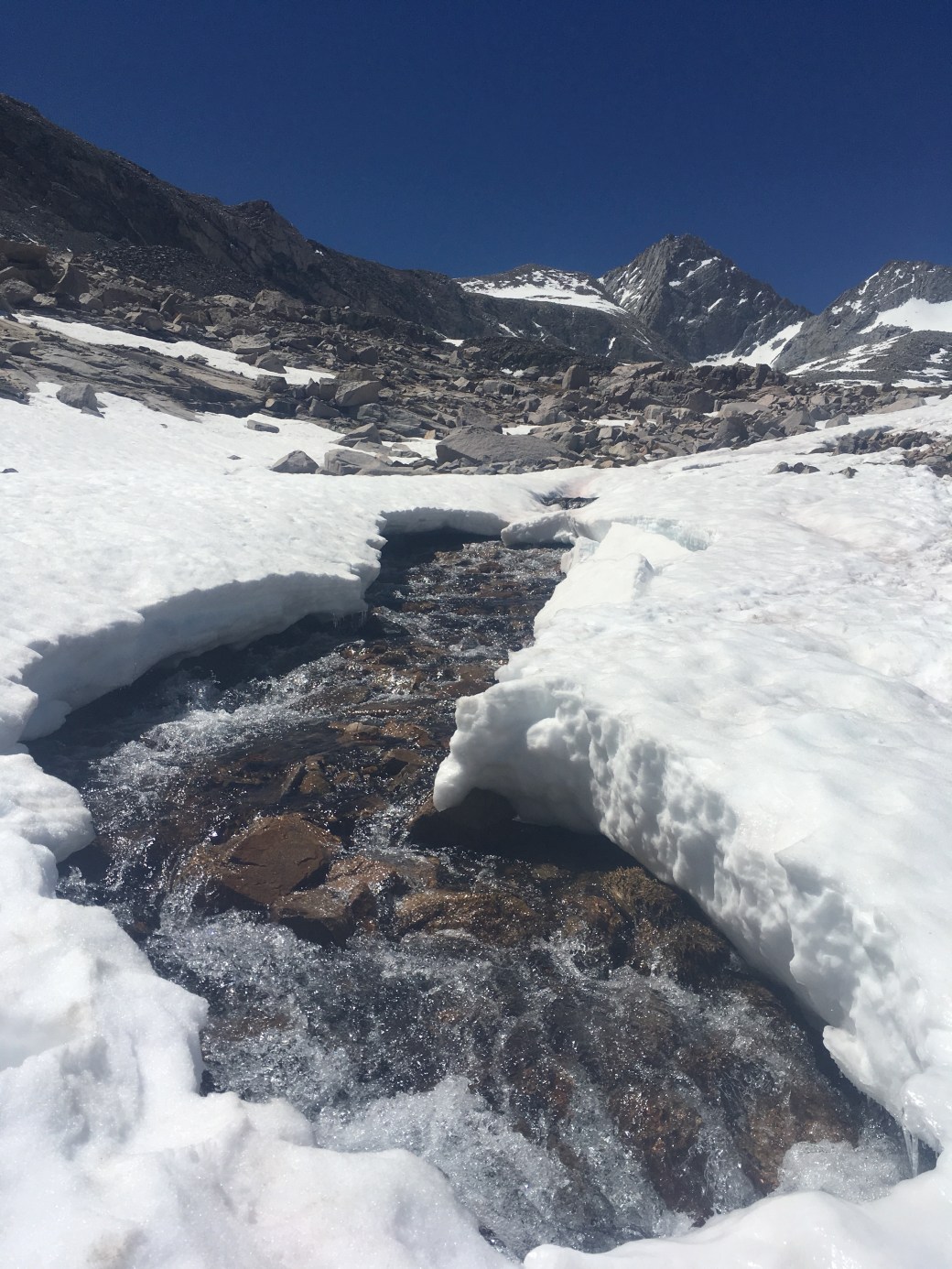 The theme of these last five days has been adjusting and adapting. Charles pointed out that we’re in the learning stage of the Sierra Nevada. In the desert we had to lea to manage the heat, long water carries, and wind events. Now we have new elements including elevation, water crossings, and snow/ice. These past few days were a little stressful trying to decide on the best plan, but we’re slowly figuring it out.