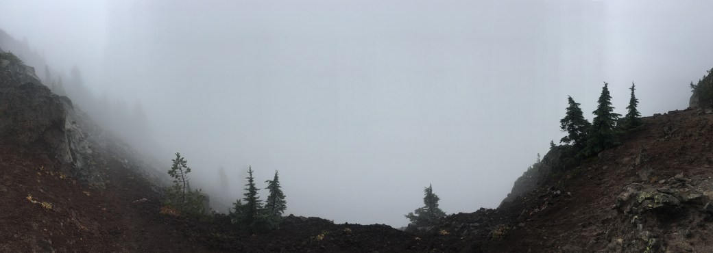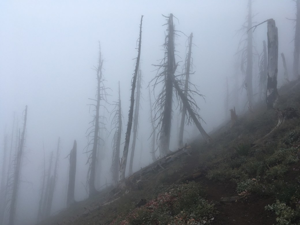 Of course, after a wonderful day one sometimes goes through a bad day. We woke up to rain and walked through a cloud most of the day. In the evening we walked through a high severity burn area from the year before, which with the clouds really creeped me out. We had to camp in a burn area, which we usually try to avoid due to the potential of falling dead trees, but this night we had no choice.